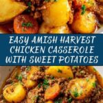 A comforting Amish Harvest Casserole combining tender chicken, sweet potatoes, peas, and cheddar cheese in a creamy sauce, baked to perfection for a hearty and satisfying meal.