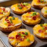 Crispy, golden baked potato rounds topped with melted cheddar cheese, savory crumbled bacon, and fresh green onions. These oven-roasted potato slices make a perfect appetizer or side dish that’s easy to prepare and satisfying to eat.