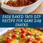 This delicious Baked Taco Dip is a crowd-pleasing appetizer perfect for gatherings and game days. It combines seasoned ground beef or turkey with a creamy base of cream cheese, sour cream, and salsa, topped with melty Mexican blend cheese and fresh vegetables. Served warm alongside crispy tortilla chips, this easy-to-make dip is flavorful, cheesy, and sure to be a hit at any party.