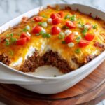 This delicious Baked Taco Dip is a crowd-pleasing appetizer perfect for gatherings and game days. It combines seasoned ground beef or turkey with a creamy base of cream cheese, sour cream, and salsa, topped with melty Mexican blend cheese and fresh vegetables. Served warm alongside crispy tortilla chips, this easy-to-make dip is flavorful, cheesy, and sure to be a hit at any party.