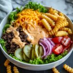 Divide the cooked beef mixture evenly between four medium-sized bowls. Next, pile on chopped romaine lettuce, freshly grated cheddar cheese, sliced cherry tomatoes, and dill pickles. Don’t forget to drizzle a generous helping of that luscious Big Mac sauce over the top—it’s the star of the show! Feel free to sprinkle on some sliced red onion if you’re craving an extra layer of flavor. Your cheeseburger bowls are now ready to enjoy!