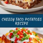 A delicious and hearty Cheesy Taco Potatoes recipe featuring crispy roasted russet potatoes topped with seasoned ground beef, melted cheddar and Monterey Jack cheeses, and fresh toppings for a flavorful Tex-Mex main course.