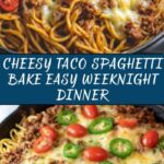 A delicious and comforting Cheesy Taco Salsa Spaghetti Bake combining the flavors of seasoned ground beef, fresh vegetables, and melted cheese baked to perfection for a quick and satisfying family meal.