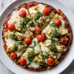 This Chicken Pesto Pizza is a flavorful homemade pizza featuring a crispy crust topped with a blend of pizza sauce and basil pesto, shredded mozzarella cheese, tender grilled chicken strips tossed in pesto, and fresh grape tomatoes. Baked to golden perfection and garnished with parmesan and fresh basil leaves, it’s a quick and satisfying meal ready in just 25 minutes.
