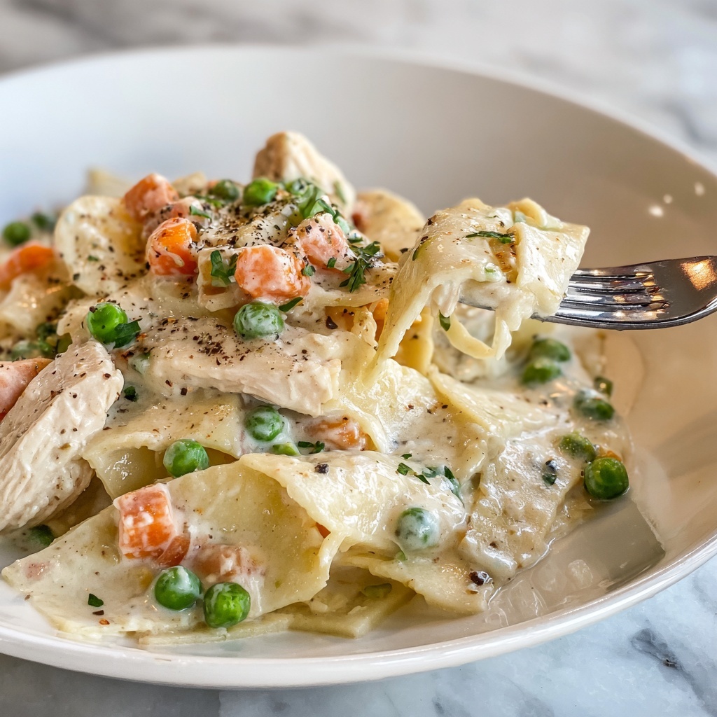 This comforting Chicken Pot Pie Noodle recipe offers all the classic flavors of a traditional chicken pot pie transformed into a creamy, hearty noodle dish. Tender egg noodles are combined with sautéed onions, garlic, peas, carrots, and cubed chicken breast in a rich, creamy sauce made from chicken broth and heavy cream. Ready in just 25 minutes, this one-pan meal is perfect for a quick and satisfying weeknight dinner that serves 8.