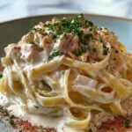 This Crab Fettuccine Alfredo is a luxurious and creamy seafood pasta dish combining tender lump crab meat with a rich Parmesan and butter-filled Alfredo sauce. Cooked fettuccine noodles are tossed in a garlic-infused cream sauce, finished with a hint of lemon and fresh parsley for brightness. Perfect for a decadent main course with Italian-American flair, this recipe serves four and can easily elevate any dinner occasion.