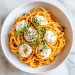 Divide the creamy pasta among serving bowls. Top each portion with a generous ball of fresh burrata cheese, letting its creamy interior melt into the warm pasta. This final touch is what makes this Creamy Red Pepper Pasta with Burrata and Herbs Recipe so special and irresistible.
