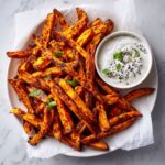 Enjoy crispy baked sweet potato fries paired with a creamy roasted garlic tahini yogurt dip. This recipe features perfectly seasoned and oven-baked fries with a gluten-free arrowroot powder coating for optimum crispiness, complemented by a flavorful yogurt dip infused with roasted garlic, fresh herbs, and tangy lemon. A healthy and delicious snack or side that’s easy to prepare at home.