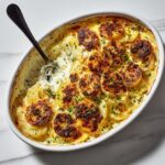 Dad’s Creamy & Cheesy Au Gratin Potatoes is a comforting and rich casserole featuring thinly sliced Yukon gold potatoes layered with onions and smothered in a velvety cheese sauce made from sharp cheddar, Gruyere, and parmesan. Baked to golden perfection, this dish is perfect as a hearty side or a satisfying main.