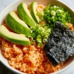 Finish by layering the top with fresh slices of avocado and a sprinkle of green onions. The avocado not only adds creaminess but also a lovely contrast in flavor and texture. Feel free to add nori strips or sesame seeds for an extra punch of umami and crunch. Serve immediately to enjoy the dish at its best.