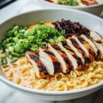 Return your cooked noodles to the skillet and toss them thoroughly in the creamy garlic sauce, ensuring every strand is coated with that spicy, cheesy goodness. Top with sliced chicken, sprinkle with sliced green onions and sesame seeds, and if you’re feeling fancy, add a soft-boiled egg to each bowl for that extra touch of richness.