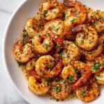 A flavorful and easy-to-make Garlic Parmesan Roasted Shrimp recipe perfect for a quick appetizer or main course. Juicy shrimp are tossed with garlic, Parmesan cheese, and Italian seasoning, then roasted to perfection with a hint of spice and fresh parsley, served alongside tangy lemon wedges.