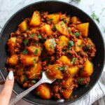 To make it vegetarian, substitute the ground beef with plant-based crumbles or cooked lentils. The potatoes and spicy tomato sauce will still make it rich and satisfying.