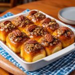 - Invert and serve: Once baked, carefully invert the pan onto a serving platter so that the sticky glaze and pecans are on top, creating a beautifully sticky and flavorful topping for the rolls. Serve warm for the best experience.