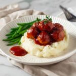 8. Serve: Serve the BBQ meatballs warm, ideally with mashed potatoes and green beans for a wholesome and delicious meal.