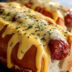 This Huge Cheese Dog Sandwich is a delicious and indulgent treat combining a jumbo cheese hot dog and a slice of pizza inside a soft hoagie roll. Topped with pepperoni slices, melted mozzarella, garlic butter, and a sprinkle of Parmesan and oregano, it’s a comforting fusion of classic American flavors in one hearty sandwich.