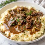 A hearty and comforting Instant Pot pot roast recipe served with creamy mashed potatoes and rich homemade gravy. This classic dish features tender beef chuck roast cooked to perfection in an Instant Pot, infused with savory herbs and sauces, paired with smooth mashed potatoes made with butter and milk for a satisfying meal.