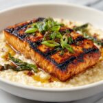 - Plate and Garnish: Serve a generous portion of the creamy Japanese risotto on each plate. Top with the seared salmon fillets. Garnish with freshly ground black pepper, snipped chives, and a sprinkle of sesame seeds. Serve immediately and enjoy your elevated Japanese-style dinner!