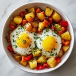 This delicious loaded breakfast hash combines crispy golden potatoes, savory sausage, and sautéed bell peppers and onions, topped with perfectly fried eggs and fresh parsley. A hearty and flavorful meal that’s perfect for starting your morning with a satisfying and colorful dish.