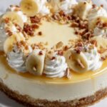 A luscious no-bake banana pudding cheesecake featuring a graham cracker crust, creamy banana-flavored cheesecake filling, and topped with whipped cream, vanilla wafers, and fresh banana slices. Perfectly chilled to set, this dessert is indulgent yet effortless.