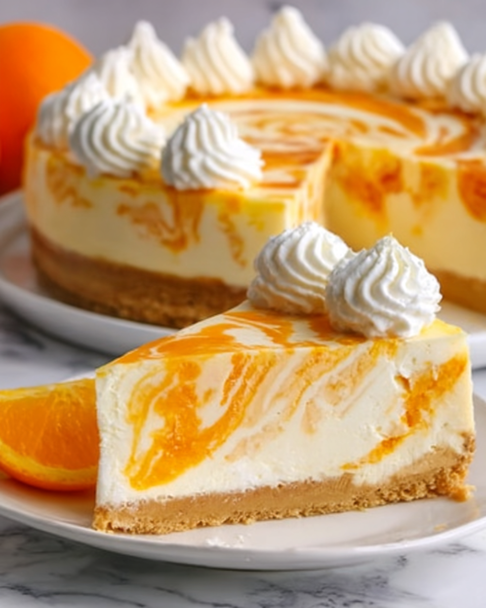 - Garnish and Serve: Before serving, top the cheesecake with whipped cream and garnish with additional orange zest or fresh orange slices.