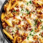 Once the pasta is tender, stir in the heavy cream, shredded mozzarella, and grated Parmesan cheese. Continue stirring until all the cheese has melted into a luscious, creamy sauce that clings beautifully to every piece of pasta and chicken.