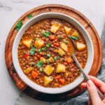 The soup should be broth-based but not too watery—think of a slightly thickened, hearty consistency with tender lentils and softened veggies throughout. Feel free to add more broth if you want it thinner or cook uncovered a little longer for a thicker texture.