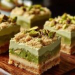 These Pistachio Dream Cookie Bars feature a buttery cookie base studded with chopped pistachios and white chocolate chips, topped with a smooth, rich pistachio layer and garnished with additional pistachios and white chocolate. Perfectly balanced in sweetness and nutty flavor, these bars are a delightful treat for any occasion.