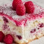 - Assemble Layers: Spread half of the cake batter evenly into the prepared pan. Next, layer the cream cheese filling over the batter, followed by the sugared raspberries. Finally, top with the remaining cake batter.