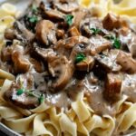 Reheat leftover stroganoff gently on the stovetop over low heat, stirring occasionally and adding a splash of broth or cream if the sauce feels too thick. For the noodles, warming briefly in boiling water or the microwave will bring back their soft, tender qualities.