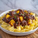 - Prepare the Noodles: While the beef simmers, cook the egg noodles according to package instructions. Drain the noodles and return them to the pot. Add unsalted butter and toss until melted and well-coated. Season with salt to taste.