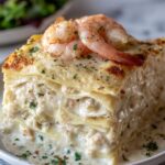 This Seafood Lasagna with Shrimp & Crab is the ultimate comfort food, combining tender pasta layers with a creamy cheese blend, succulent shrimp, and delicate crab meat, all baked in rich Alfredo sauce for a decadent, satisfying meal perfect for family dinners or special occasions.