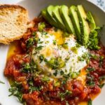 Once the eggs are ready, sprinkle the shakshuka generously with crumbled feta and fresh parsley or cilantro. Serve the piping hot tomato and egg skillet alongside the vibrant avocado salad, accompanied by warm pita or crusty bread for dipping and savoring every bite.
