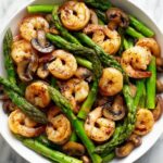 A quick and healthy shrimp and asparagus stir-fry with mushrooms, infused with garlic and ginger, cooked in a savory soy sauce that’s perfect for a nutritious weeknight meal.