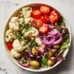 In a large bowl, gather the star ingredients: the cooled cauliflower, Kalamata and green olives, capers, thinly sliced red onion, and halved cherry tomatoes. Add in the freshly chopped parsley and basil if you’re using it. The mix of textures—crispy cauliflower, chewy olives, tender tomatoes—creates a salad that is never boring.