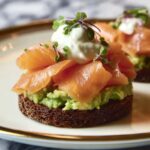 - Add toppings: Place a thin slice of smoked salmon on top of the avocado spread, followed by a few pieces of diced roasted red peppers and a sprinkle of fresh chopped chives for brightness.