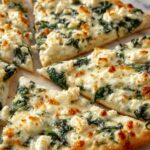 This Spinach White Pizza features a creamy garlic white sauce complemented by sautéed fresh spinach and a blend of ricotta, mozzarella, and Parmesan cheeses. The pizza dough crisps beautifully in a hot oven, making it a perfect quick and flavorful meal or appetizer.