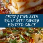This Tofu Skin Roll recipe features delicate tofu skin wrapped around a savory vegetable filling, pan-fried to a golden crisp, and then braised in a fragrant spiced broth. The rolls are served sliced with a flavorful sauce and fresh cilantro garnish, making it a delicious and satisfying vegetarian dish perfect for a light meal or appetizer.