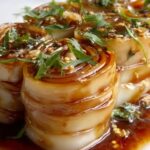 This Tofu Skin Roll recipe features delicate tofu skin wrapped around a savory vegetable filling, pan-fried to a golden crisp, and then braised in a fragrant spiced broth. The rolls are served sliced with a flavorful sauce and fresh cilantro garnish, making it a delicious and satisfying vegetarian dish perfect for a light meal or appetizer.