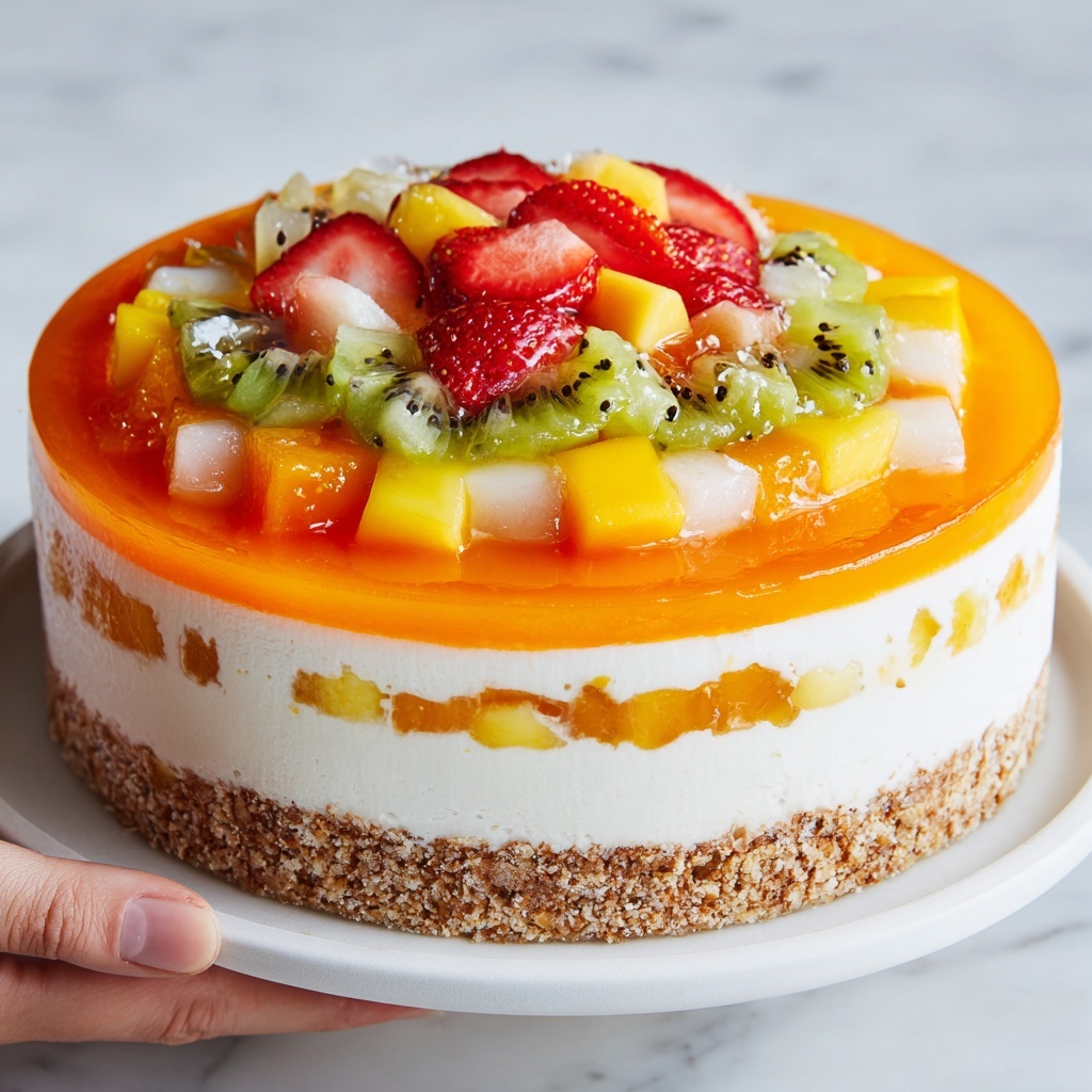 This Tropical Fruit Salad Cheesecake is a luscious and colorful dessert featuring a creamy cream cheese filling studded with vibrant tropical fruits like mango, pineapple, and kiwi. Set on a buttery graham cracker crust and topped with fresh strawberries and a glossy fruit jam glaze, this cheesecake brings a refreshing twist to a classic favorite. Perfect for warm weather gatherings or anytime you crave a fruity, sweet treat.