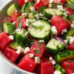 A refreshing Mediterranean-inspired Watermelon Feta Cucumber Salad perfect for hot summer days. This no-cook salad combines juicy watermelon cubes, crisp cucumbers, salty feta cheese, and fresh mint leaves, all brought together with a zesty lime and olive oil dressing. Quick to prepare and bursting with sweet, savory, and tangy flavors, it’s an ideal light dish or side.